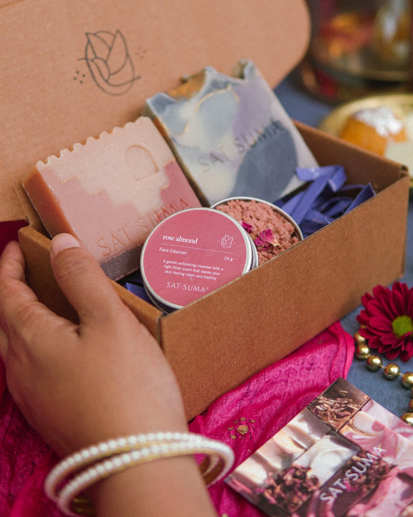 Each box contains a set of 2 soaps from our Festive Edit. You can also add on a super gentle Rose Almond Face Scrub and an exfoliating bag.